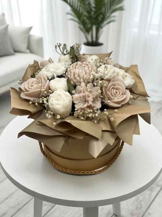 Ten wyjątkowy bukiet wboxie łączy w sobie szyk i trwałość sojowych kwiatów. Subtelne kolory – od pasteli po głębokie odcienie – z naturalnymi suszonymi kwiatamisprawiają, że to zaskakujący prezent, który zostaje na wiele miesięcy.