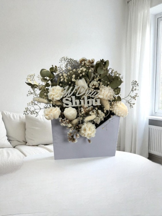 To bukiet który przetrwa zdecydowanie dłużej niż zwykłe kwiaty, tworząc na długi czas pachnącą pamiątkę tego szczególnego dnia. Eleganckie, ręcznie układane kwiaty w białych, kremowych lub pastelowych odcieniach tworzą romantyczną dekorację. Idealny jako prezent dla młodej pary, w formie podziękowań lub ozdoba weselnego stołu.